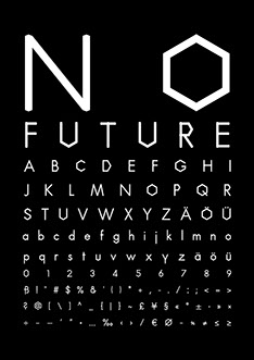 "no future" ist eine, auf den Proportionen der Futura basierende, serifenlose Schrift. Sie zeichnet sich durch ihr eckiges Erscheinungsbild aus und beinhaltet neben Majuskeln und Minuskeln auch die Zahlen 0–9 und 36 verschiedene Glyphen.